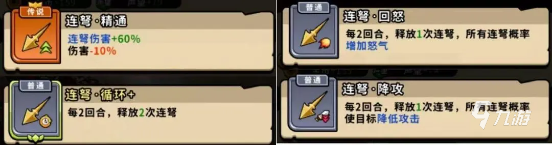3、連弩;全能輔助的基色,這個(gè)計(jì)策大家肯定都不會(huì)感覺(jué)到陌生,每回合必定觸發(fā)的機(jī)制,還附帶了多樣的buff,就成為了最好用的輔助計(jì)策,敵人減血,友方加血,加怒氣,兼顧了續(xù)航和爆發(fā)能力,每一種buff都是對(duì)局中關(guān)鍵的因素,適合在BOSS戰(zhàn)中反制,高難度副本中的容錯(cuò)也會(huì)得到提升。