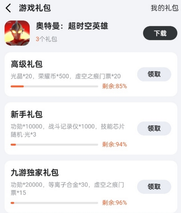 除了通用禮包碼之外,玩家如果是通過九游APP下載并安裝該游戲,還可以在九游平臺內(nèi)獲得專屬福利禮包。平臺提供的新手禮包、高級禮包以及九游獨(dú)家禮包,目前依然有大量余量,禮包內(nèi)容包括光晶、榮耀幣、功勛、戰(zhàn)斗記錄儀、技能芯片等資源,幫助玩家快速提升角色戰(zhàn)斗力和游戲進(jìn)度。