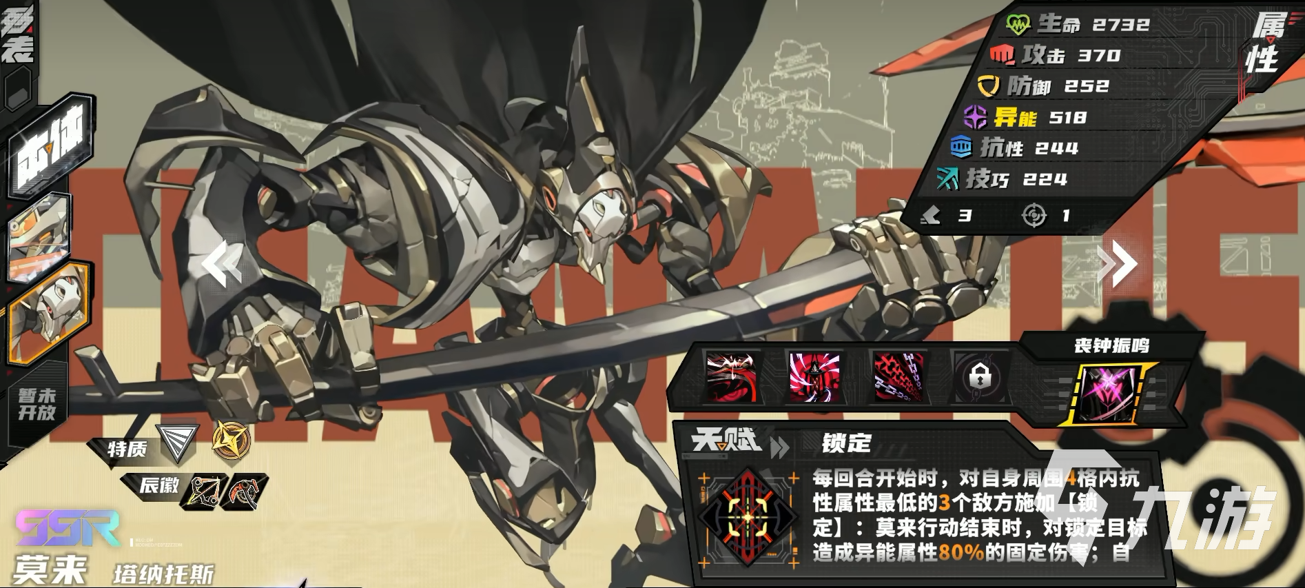 莫來是遠程單體輸出,天賦能在每回合開始時,對自身4格范圍內(nèi)抗性最低的3位敵人施加鎖定,每次攻擊鎖定的敵人會造成額外傷害,還擁有一定控制技可以讓敵人不能使用技能或移動,機甲可以讓敵人的抗性降低,從而更容易遭受負面效果。