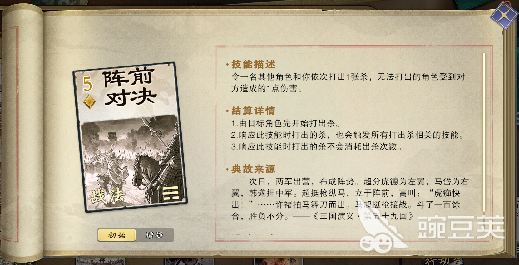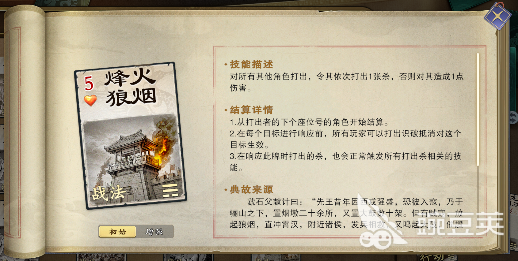 這個(gè)戰(zhàn)法牌還是比較建議大家屯一下的,能用于抵消各種戰(zhàn)法牌,包括這張牌本身都是可以的,它在關(guān)鍵時(shí)刻會(huì)發(fā)揮出比較大的作用,比如說,對(duì)方?jīng)]有手牌就可以多多使用,阻止敵人過牌,作為常用手段,一般用來阻止敵方使用“劫營”,“破陣”之類的戰(zhàn)法。