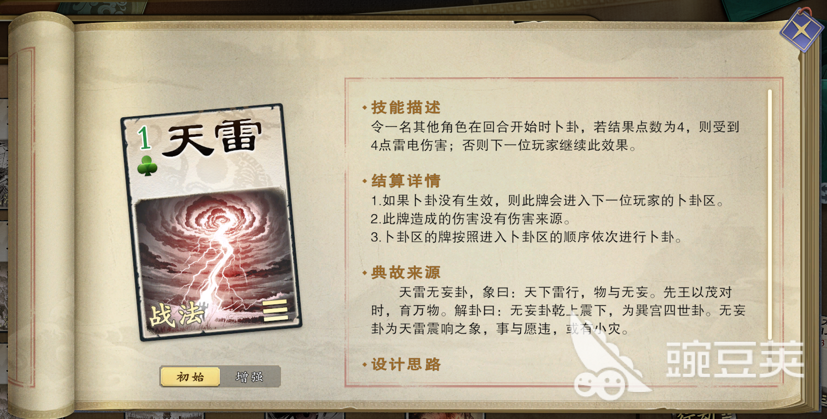 掛上“天雷”之后會(huì)展開判定,比如是4,那就造成4點(diǎn)傷害,未成功觸發(fā),還會(huì)傳遞給下一位,利用識(shí)破可讓天雷無效,然后傳遞給下個(gè)玩家,這個(gè)牌的傷害比較高,建議手中要保留識(shí)破,這樣關(guān)鍵時(shí)刻能報(bào)名,作為雙刃劍型的戰(zhàn)法,關(guān)鍵時(shí)刻是能扭轉(zhuǎn)戰(zhàn)局的,建議先給距離自己遠(yuǎn)的對(duì)手使用。