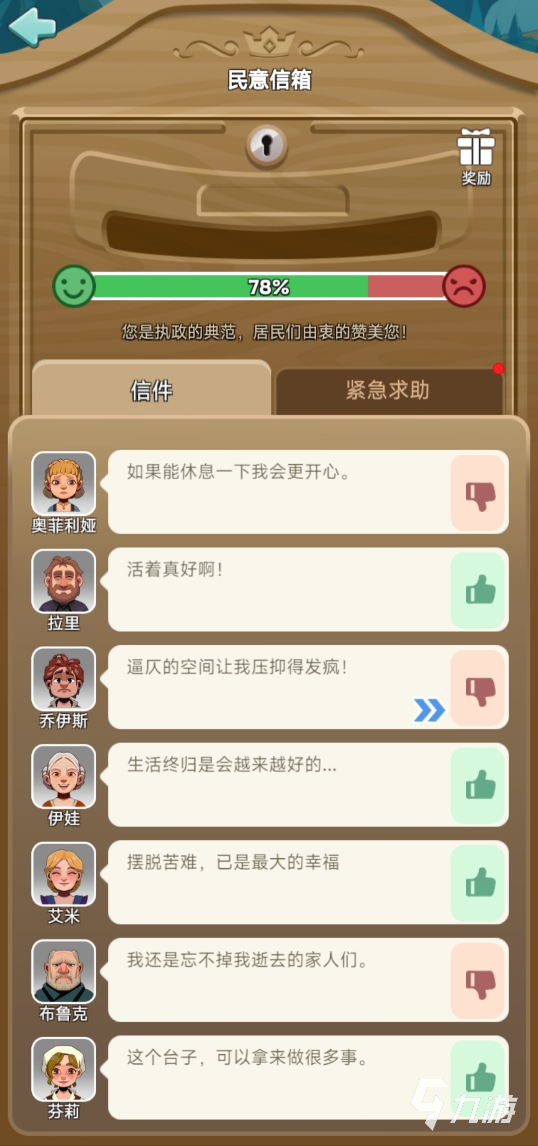 首先,玩家可以在城鎮(zhèn)中心前方找到“民意信箱”,這是整個(gè)系統(tǒng)的核心入口。每天,居民會(huì)根據(jù)當(dāng)前城鎮(zhèn)的發(fā)展情況,隨機(jī)發(fā)表意見。這些意見將自動(dòng)生成信件投遞到民意信箱中,分為兩類:普通信件和緊急求助。普通信件往往反映居民對居住環(huán)境、工作條件或生活節(jié)奏的反饋,比如住房太小、工廠太吵、缺乏娛樂等。針對這些問題,玩家需要通過實(shí)質(zhì)性的調(diào)整來回應(yīng),比如升級(jí)民居、改善工業(yè)設(shè)施、增加節(jié)日活動(dòng)等。這些優(yōu)化不僅能逐步滿足居民的基本需求,也會(huì)在系統(tǒng)后臺(tái)提升整體民意評(píng)分。