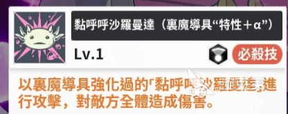她的必殺技會讓被道具強化過的沙羅曼達進行攻擊,對所有敵人造成傷害,賦予所有隊友攻擊力和魔力增加的增益,并讓相同屬性的隊友暴擊傷害增加,持續(xù)2個回合,她的協(xié)力技會賦予伙伴魔力增加的增益,有概率讓該同伴行動力增加。