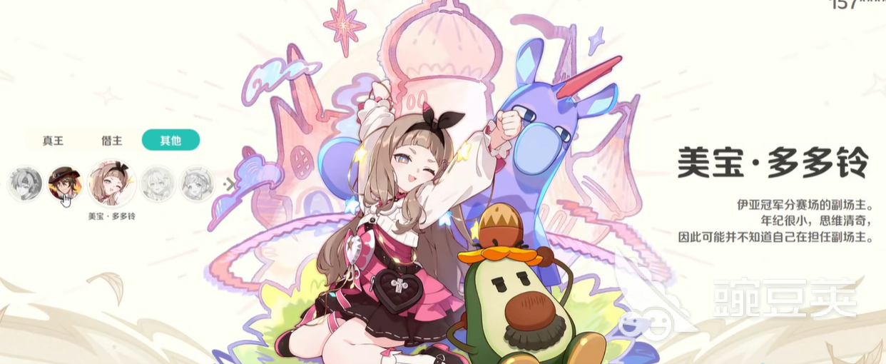 美寶?多多玲隸屬于游戲中的“其他陣營(yíng)”,在伊亞冠軍分賽場(chǎng)擔(dān)任副場(chǎng)主一職。她年紀(jì)較小,性格活潑,思維方式格外清奇,或許是因年齡與認(rèn)知的緣故,尚未清晰意識(shí)到自己所承擔(dān)的副場(chǎng)主職責(zé),日常行事帶著孩童般的隨性。角色設(shè)定偏向甜美蘿莉風(fēng)格,蓬松的發(fā)型搭配可愛(ài)的服飾,外形極具辨識(shí)度,而“清奇思維”更是其核心標(biāo)簽。