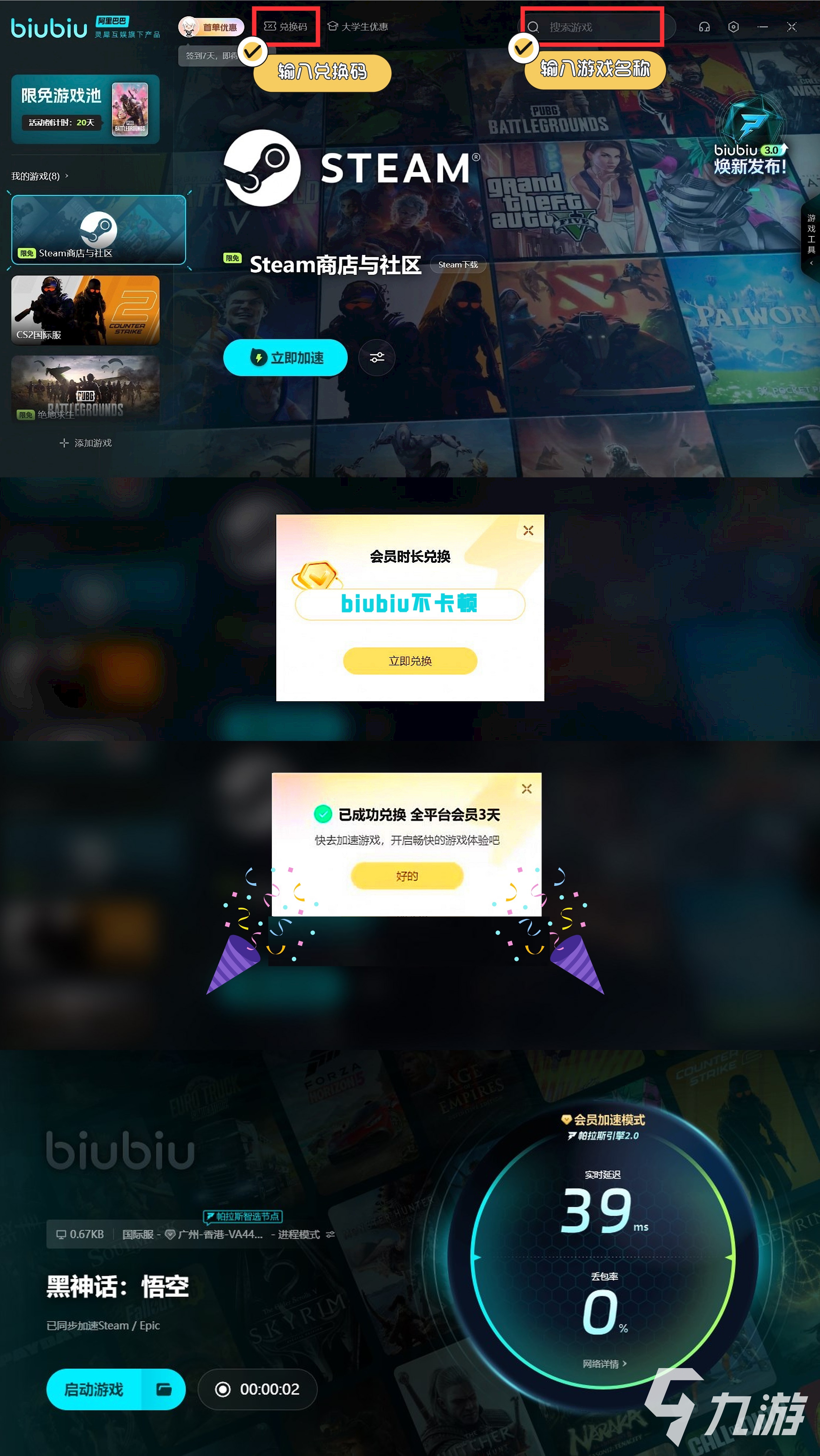 福利還不止于此呢!新老用戶也有通用的福利兌換碼“biubiu不卡頓”,只要按照下列流程正確輸入小寫的兌換碼,就可以獲得3天的全平臺會員。這么算來對新用戶就是足足96小時的免費加速時長了!