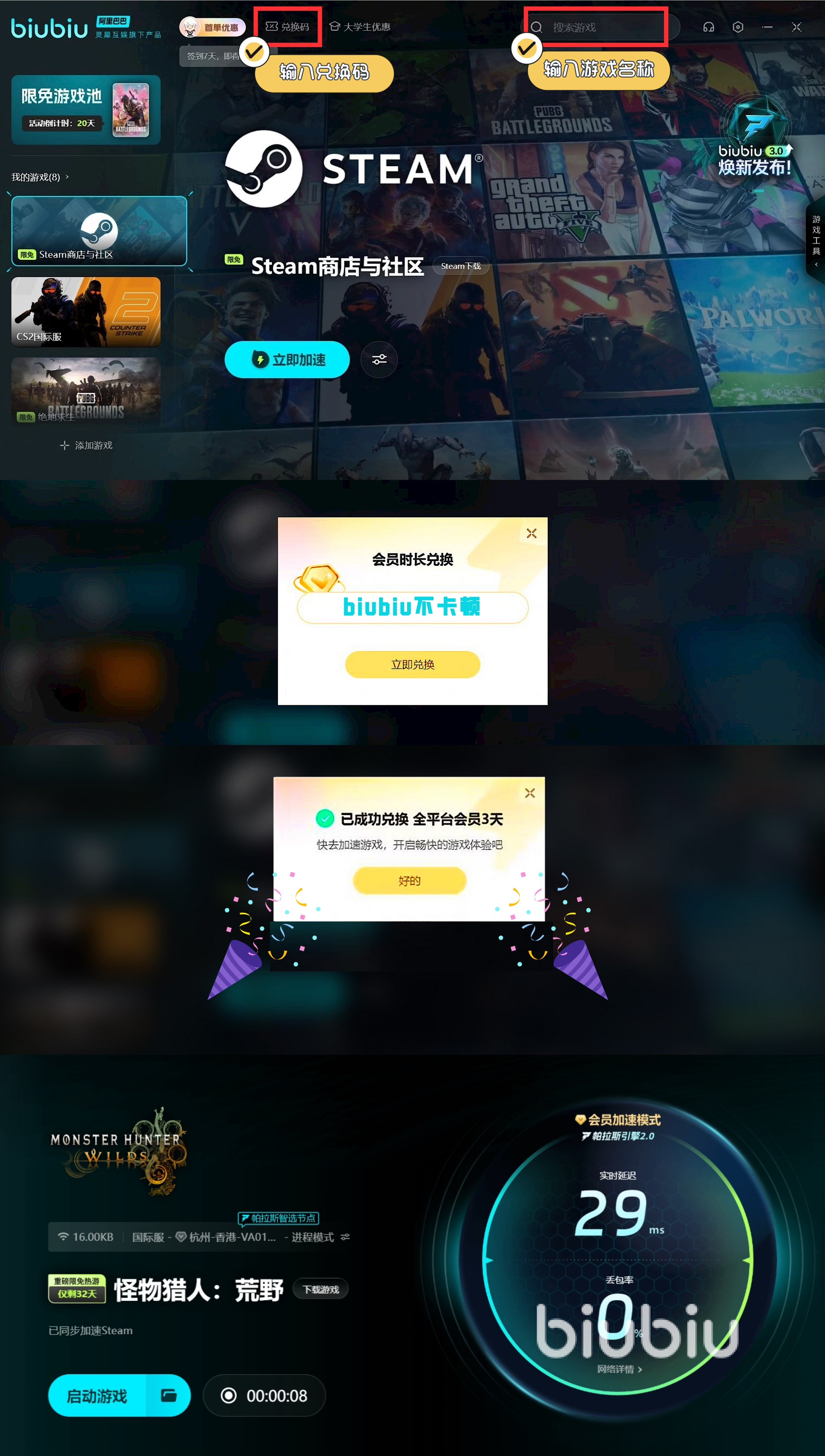 游戲背后也是一個有獵人開荒過程的故事,更何況還有一個可愛的喵隨行,在整個過程中也有很多和NPC互動的內(nèi)容,在這些劇情背后其實是一幀幀的畫面數(shù)據(jù),一旦有一個數(shù)據(jù)丟失就會導致圖形撕裂的問題,經(jīng)過升級的biubiu能通過補發(fā)數(shù)據(jù)包的形式來填補丟失的幀數(shù),不影響玩家的體驗,而且加速器上還推出了免費的會員加速福利,通過“biubiu不卡頓”兌換到3天的加速,對于第一次注冊的用戶還能直接獲得3h的加速,讓想要體驗下加速器到底好不好用的用戶能毫無顧慮的體驗下加速。