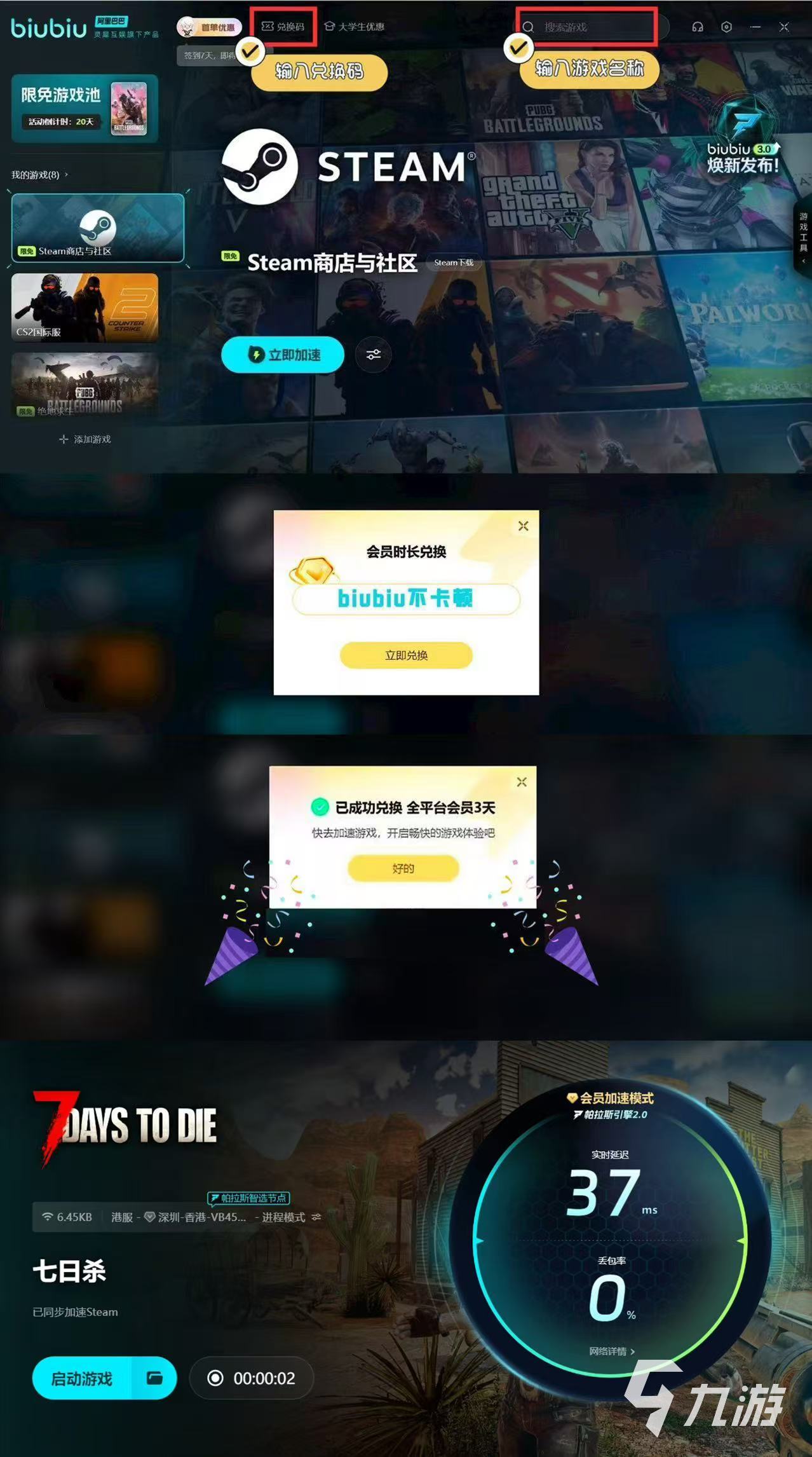 至于biubiu的加速到底好不好用,大家可以親子來體驗(yàn)下。當(dāng)然體驗(yàn)的過程中可以選擇先來加速器上領(lǐng)取好幾天的免費(fèi)加速活動。用“biubiu不卡頓”這個(gè)口令可以在加速器界面上的【兌換】處獲得3天的免費(fèi)加速時(shí)間,如果你還是第一次注冊這款加速器的話,還能在注冊并登陸后直接獲得3h的加速。有了這些加速時(shí)間,相信著足夠玩家們好好的來校驗(yàn)下biubiu的加速。