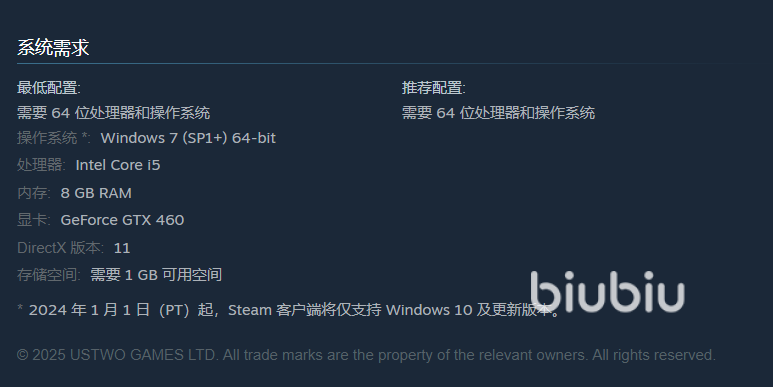 可以看到頁面的配置信息中,最低版本的操作系統(tǒng)只需要window7以上,處理器也是酷睿5系的低端路線,甚至顯卡只需要GTX 460以上即可,1GB以內(nèi)的包體大小,可以說基本上市面上所有主流設(shè)備都可以承載這款游戲的流暢運行。