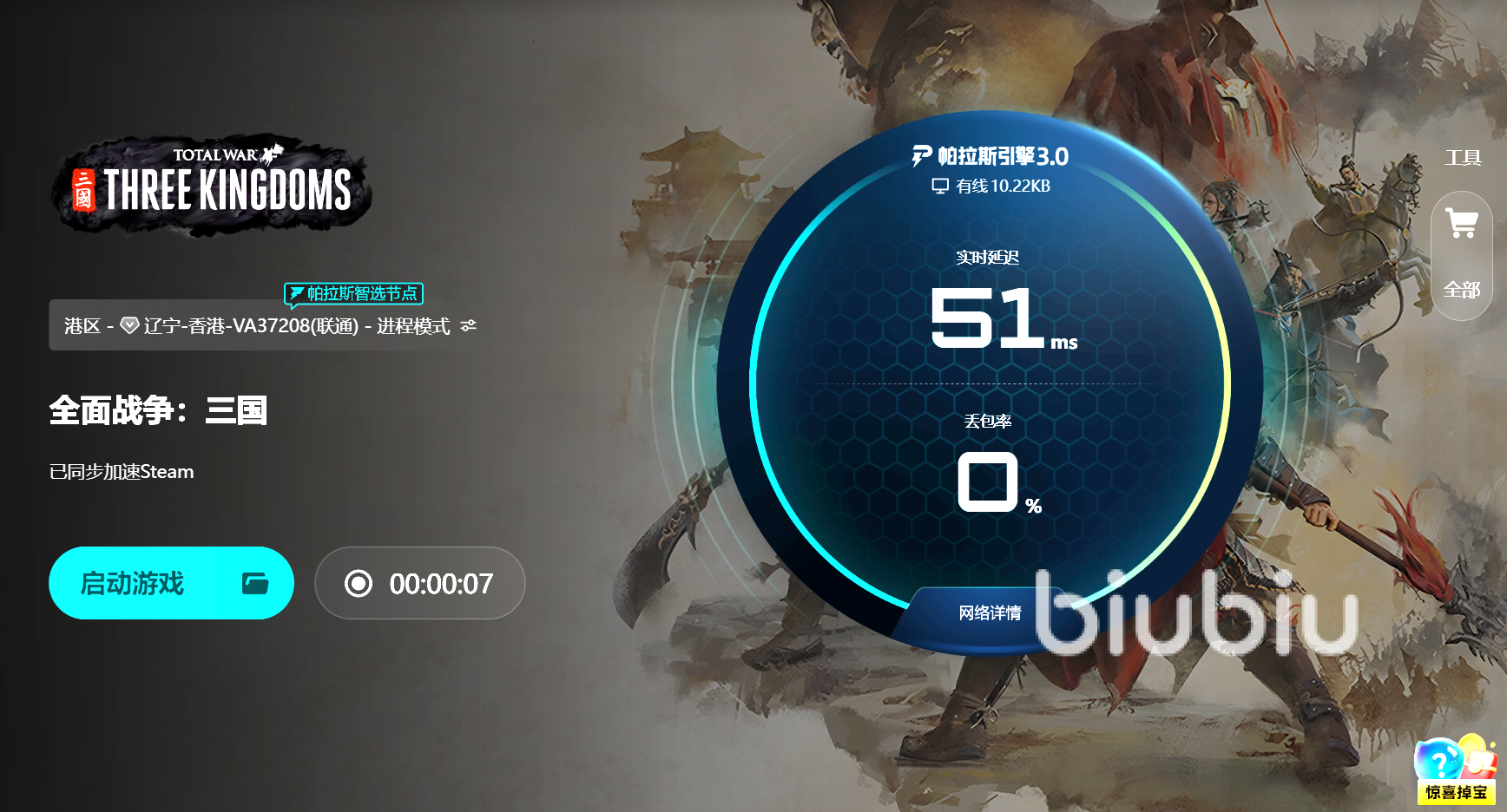 從實(shí)際體驗(yàn)上來看,用biubiu加速器后,《全面戰(zhàn)爭(zhēng):三國(guó)》的閃退問題得到顯著改善。無論是加載戰(zhàn)役地圖、指揮萬人對(duì)戰(zhàn),還是切換存檔、進(jìn)入多人模式,整體連接更加穩(wěn)定。即便在晚間高峰期或跨區(qū)聯(lián)機(jī)環(huán)境下,延遲依舊維持在較低水平,玩家能夠全神貫注于戰(zhàn)術(shù)部署與操作,不再被頻繁的異常打斷。