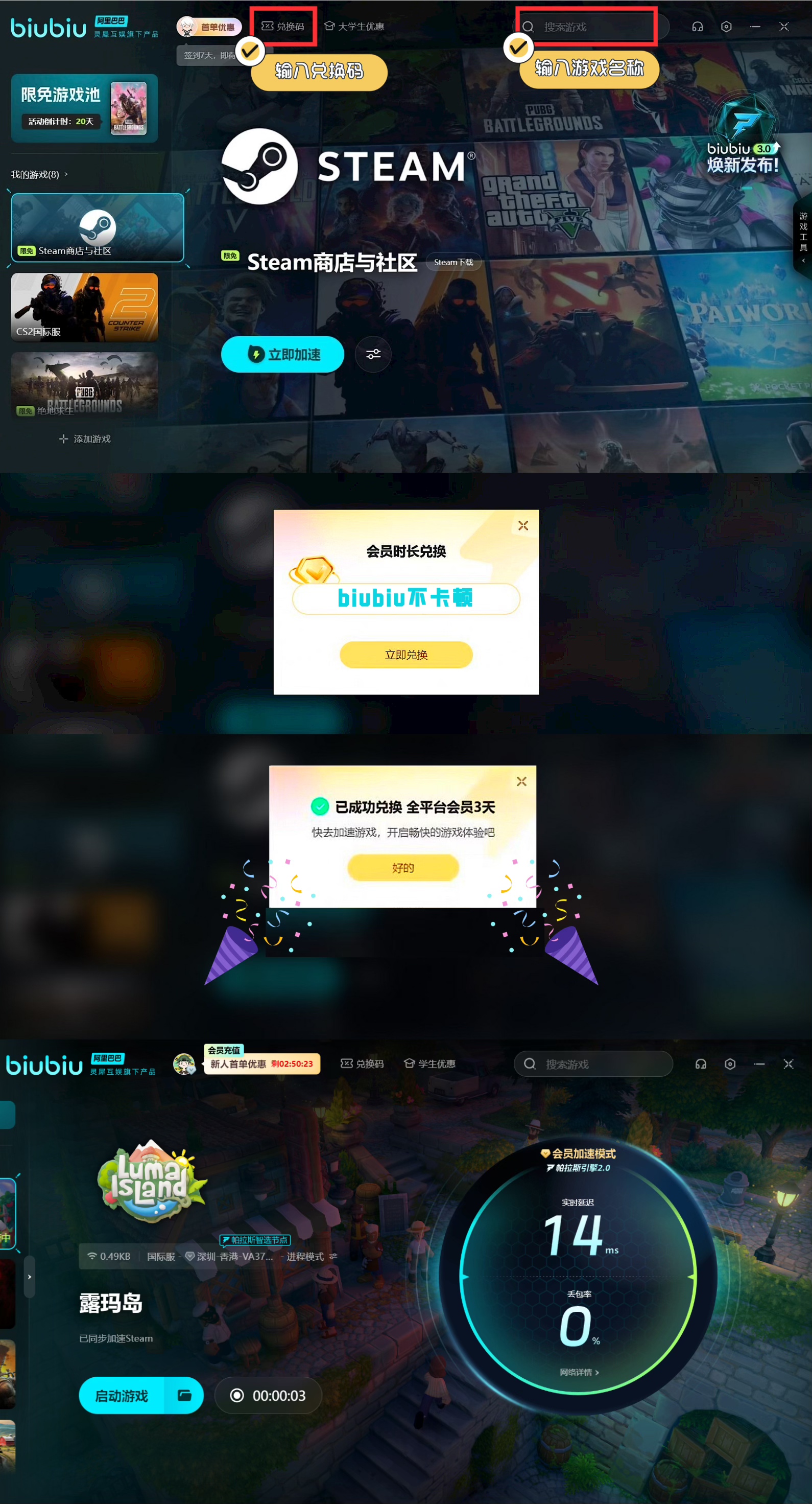 為了回饋廣大用戶,平臺還上線了福利活動,如果你是新用戶的話,那么完成注冊后就能領(lǐng)到24小時加速時長,此外,所有用戶在輸入兌換碼【biubiu不卡頓】后,都能領(lǐng)到3天的加速時長。
