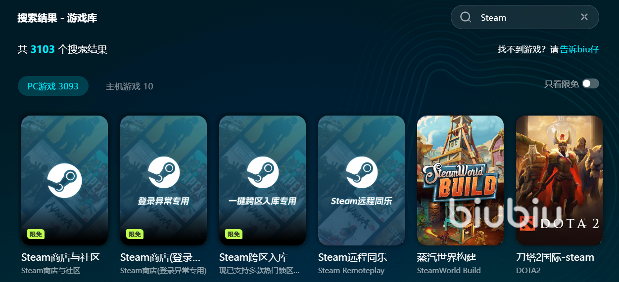 霧隱天途地圖真實又細膩,為了畫面流暢度,玩家安裝好biubiu工具。下載安裝包之后,大家運行軟件,在上方搜索框找到steam,通過該平臺運行霧隱天途,完成快捷游戲加速。
