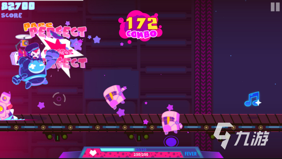 向前或向上擊打,在操作上也不復(fù)雜。游戲中鼓點(diǎn)判定的設(shè)計(jì)也是以這兩種基本操作為基礎(chǔ)進(jìn)行分支擴(kuò)展,比如跳躍用來躲避無法擊碎地面的“齒輪”,通過向上擊打來完成持續(xù)的note,為了擊退BOSS而使用的連續(xù)敲擊雙鍵等等。可以說,在分支上簡化了,雙軌互動的降低也是必然的。但能在容易操作的前提下又不顯乏味,則是游戲技能的兼顧、擊打爽感等優(yōu)秀要素的契合。