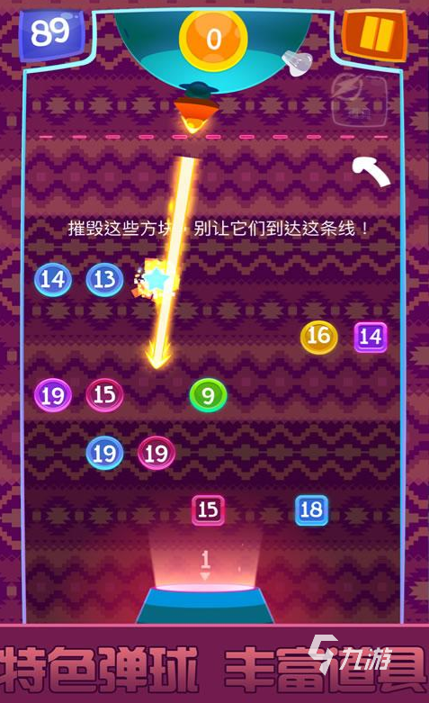 這個游戲其實就是我們小時候玩的那種彈球打磚塊的游戲,大家要控制一個小球,讓它在那些有數字的磚塊之間彈來彈去。每次彈到磚塊,上面的數字就會減少,直到數字變成0,磚塊才會真的被打掉。玩的時候還會掉下來一些厲害的道具,比如可以讓彈球變成好幾個,或者讓我們的擋板變得更長。用好這些道具,過關就會變得更簡單了。
