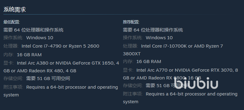 根據(jù)目前官方透露的信息,游戲在4K/60幀下的推薦顯卡為RTX 3070或AMD RX 6800,這意味著,如果你想要在高畫質(zhì)下流暢體驗游戲,一塊中高端的顯卡是必不可少的。游戲的最低配置至少需要GTX1650或是RX480,I7的處理器是通用的需求,考慮到魂系游戲通常對硬件有一定要求,建議大家至少準備一臺中等配置的電腦。