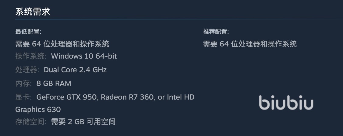 為讓玩家順利體驗(yàn)該作,其最低配置要求為:處理器需雙核2.4GHz;內(nèi)存8GB RAM;顯卡建議選擇GeForce GTX 950, Radeon R7 360;硬盤需2GB可用空間。若想運(yùn)行流暢且支持聯(lián)機(jī),建議升級至i5處理器、16GB內(nèi)存及GTX1650顯卡。