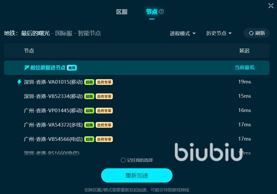 biubiu針對(duì)海外游戲進(jìn)行深度網(wǎng)絡(luò)優(yōu)化,能夠提供極速的網(wǎng)絡(luò)傳輸,其即時(shí)加速功能十分強(qiáng)大,玩家只需輕松點(diǎn)擊即可開或者停,整體使用體驗(yàn)非常便利。當(dāng)網(wǎng)絡(luò)線路出現(xiàn)擁堵,biubiu的會(huì)員用戶能享受到專屬的帕拉斯智選節(jié)點(diǎn)服務(wù)。這一智能功能會(huì)自動(dòng)篩選并幫選當(dāng)前延遲最低的線路,確保網(wǎng)絡(luò)連接始終保持在最佳狀態(tài)。