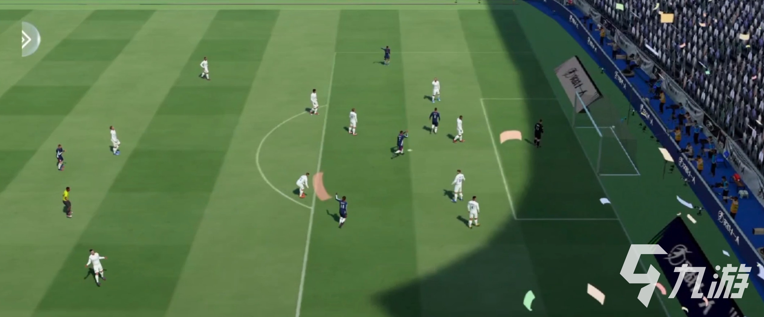在操作上玩家們并不能自由的去選擇每個(gè)球員的走向和控制權(quán),而是根據(jù)傳球的方向離他最近的我方球員將會(huì)自動(dòng)獲得控制權(quán),而其他球員都是在隨機(jī)AI的運(yùn)行下在地圖內(nèi)合理的位置隨意走動(dòng)的,這一點(diǎn)其實(shí)這款游戲已經(jīng)做的非常好了,除了沖刺、加速施壓和鏟斷之外,在即將進(jìn)球的時(shí)候也可以使用傳球,射門和直塞操作,配合方向桿很有踢球的操作手感。