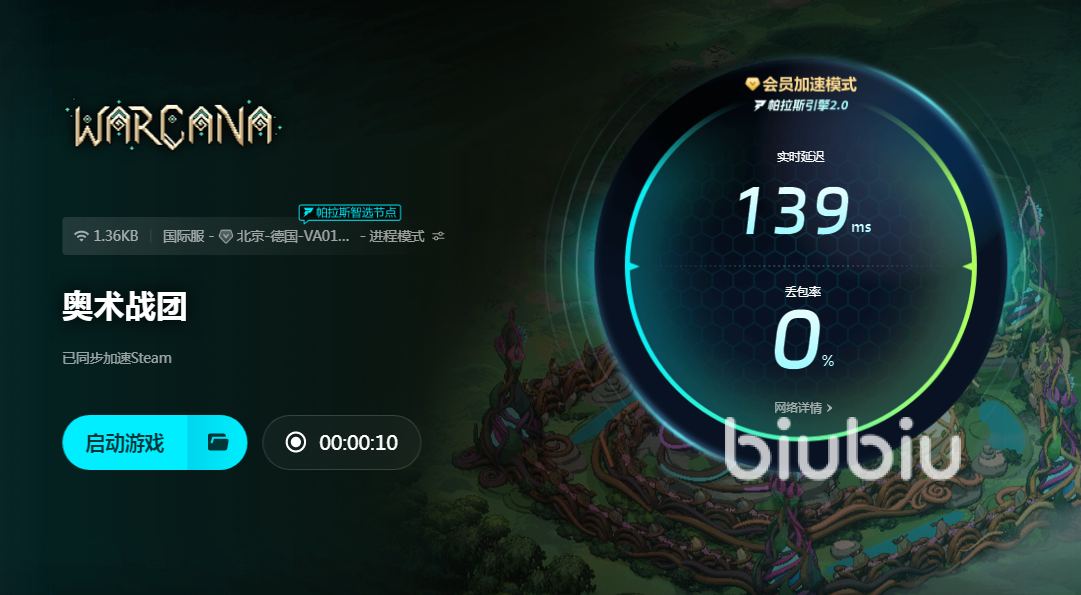 通過(guò)上面的鏈接完成biubiu下載安裝之后,直接輸入奧術(shù)戰(zhàn)團(tuán)名稱(chēng)就可以搜索到選項(xiàng),點(diǎn)擊這個(gè)選項(xiàng)進(jìn)行一鍵優(yōu)化后,會(huì)進(jìn)入到加速頁(yè)面中。此頁(yè)面就可以看到當(dāng)前所連接節(jié)點(diǎn)和其他備選節(jié)點(diǎn)。絕大多數(shù)情況下,biubiu已經(jīng)智能選擇完畢,找到了目前的最優(yōu)連接線(xiàn)路和節(jié)點(diǎn),不需要更換,直接打開(kāi)游戲運(yùn)行就可以了。但如果確實(shí)有特殊要求或者是智能選擇出來(lái)的達(dá)不到目的,也可以直接手動(dòng)進(jìn)行點(diǎn)擊選擇。每一個(gè)節(jié)點(diǎn)的后面都具有現(xiàn)在的延遲情況,找到延遲最低的選擇也是可以的。連接上之后,在游戲運(yùn)行過(guò)程中,如果出現(xiàn)問(wèn)題,例如這個(gè)節(jié)點(diǎn)過(guò)于擁堵,那么如何也會(huì)隨時(shí)切換成其他節(jié)點(diǎn),響應(yīng)速度非??欤軌蜃層脩?hù)保持在低延遲狀態(tài)下運(yùn)行。