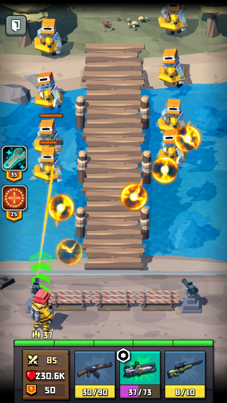 《暴走槍手》游戲采用了一種與眾不同的防守射擊的玩法,在機制上在機制上有著向僵尸開炮異曲同工的設(shè)定,玩家將通過種類萬千的槍械結(jié)合著技能,以一種掛機的形式守在橋頭,來為所欲為的射擊攻勢兇猛的敵人,所有的槍械都是可以在對戰(zhàn)中進行更換以及升級的,隨著擊殺數(shù)量的增加,玩家還可以解鎖大招,在怪物更密集的時刻進行釋放。
