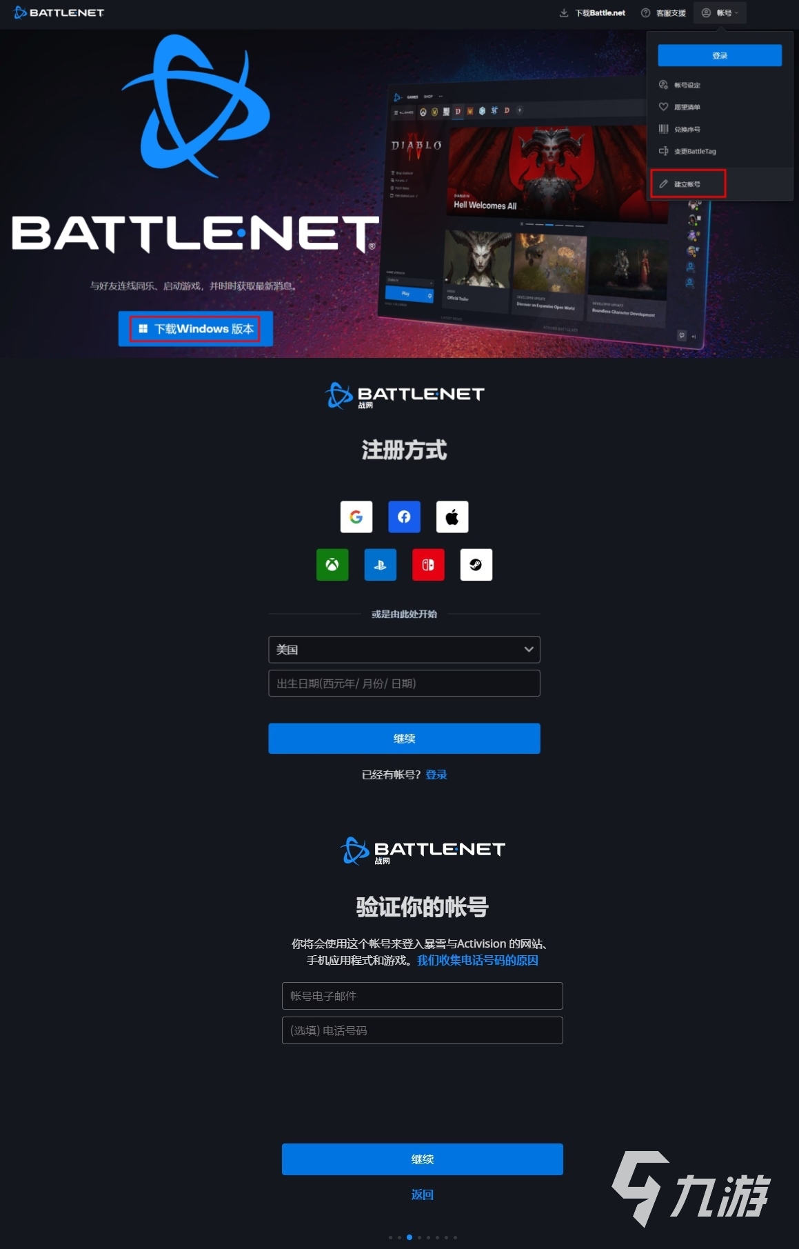 隨后這里會要大家下載戰(zhàn)網(wǎng)客戶端,可以先下客戶端再從客戶端里注冊,也可以先在網(wǎng)站注冊之后直接登錄客戶端。這里以后者為例,點擊右上角的“賬號”下拉菜單中選擇“建立賬號”,進入賬號注冊步驟