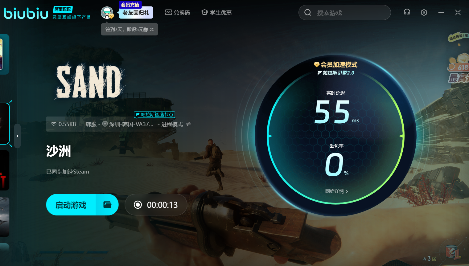 沙洲中的世界頗為殘酷,一旦延遲變高,就有可能被周圍的沙塵暴所席卷。只要用上biubiu后,網(wǎng)速自然變好,讓各位有時間去遠(yuǎn)離自然災(zāi)害。要是剛注冊的新人,那就能立即獲得24小時的免費加速;另外新老用戶通過兌換碼【biubiu不卡頓】,就能額外獲得三天免費加速。如果在戰(zhàn)斗期間太卡的話,那很容易被周圍的流寇所擊殺。所以建議用上加速器,這樣才能勇敢前行并戰(zhàn)斗,避免錯失了良機。