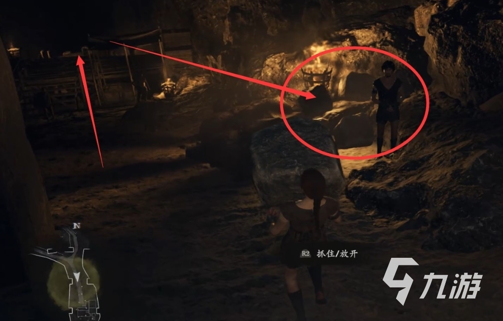 此時(shí)進(jìn)入洞穴后,可拾起一塊石頭并將其放置到盧克旁邊,這個(gè)過程主要就是為了教會玩家抓取的技能,比如可去使用抓取能力將小怪物或物體抱起來并扔出,而對于大型怪物,則可利用抓取技能攀爬到它的身上。