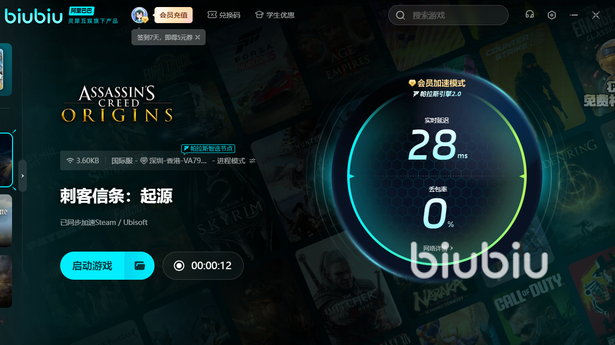 刺客信條起源中的世界起源于海外,所以暫時(shí)還沒有上線國服,也在情理之中。這時(shí)我們可以用上biubiu,提速過后就能遠(yuǎn)渡重洋,成為一名真正的刺客。新用戶的話可獲得3小時(shí)的免費(fèi)加速,另外新老用戶輸入【biubiu不卡頓】,又能額外獲得三天免費(fèi)加速。如果在進(jìn)行刺殺行動(dòng)時(shí)太卡的話,可能在潛行期間就被小兵發(fā)現(xiàn)了。這時(shí)可用加速器,提速后即可放心進(jìn)入潛行形態(tài),無懼這種危險(xiǎn)的機(jī)關(guān),讓你直通大結(jié)局。