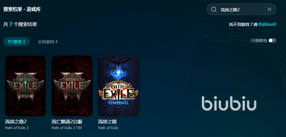 biubiu加速范圍廣,可以加速全球上萬款游戲,大家下載biubiu以后在里面搜索流放之路2就能看到加速資源了。除了這款游戲以外,biubiu還收錄了其他游戲,并對這些游戲都進行分類。用戶可以通過最新游戲、熱門游戲來找到自己想玩的。