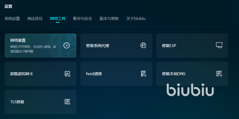 biubiu還準備了實用工具箱協(xié)助用戶優(yōu)化改善電腦環(huán)境,想要清理緩存或者是想要重置DNS都可以。很多玩家只顧著玩游戲,對于電腦網(wǎng)卡修復一竅不通,遇到問題以后也找不到人來幫忙看看,現(xiàn)在有了biubiu大家不用四處求人了,基礎的網(wǎng)絡故障都可以用它來修復。