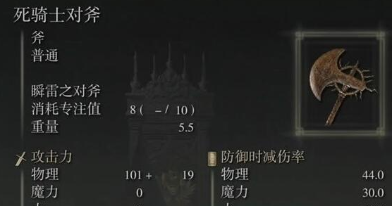 首先讓我們來(lái)看看這把斧頭的基本信息。它屬于斧類(lèi)武器,是一種非常實(shí)用的近戰(zhàn)武器。在戰(zhàn)斗中,它可以造成物理和雷電兩種屬性的傷害,攻擊力相當(dāng)可觀。此外它的防御時(shí)減傷率也相當(dāng)不錯(cuò),可以在一定程度上減輕玩家受到的傷害。當(dāng)然,想要駕馭這把斧頭,玩家需要具備一定的力量、靈巧和信仰屬性,這也是對(duì)玩家實(shí)力的一種考驗(yàn)。
