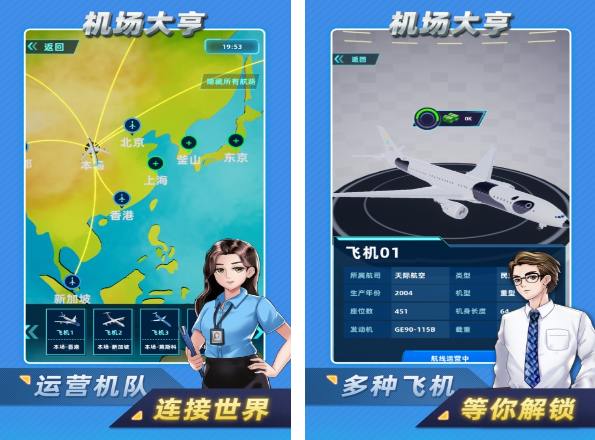 玩家的角色是機(jī)場管理者,可以建設(shè)獨(dú)一無二的飛機(jī)場,逐漸增添機(jī)場里面需要的設(shè)備,使客人的流量增加。還要仔細(xì)維護(hù)飛機(jī)功能以及做好清潔工作,再根據(jù)機(jī)場的場地面積和地形,安排好候機(jī)場、跑道等位置。玩家應(yīng)持續(xù)增強(qiáng)自身的業(yè)務(wù)技能,推動航空公司實(shí)現(xiàn)多元化發(fā)展,進(jìn)而提升飛機(jī)的運(yùn)輸能力,最終實(shí)現(xiàn)更高的收益目標(biāo)。