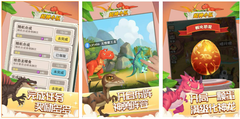 這是款以恐龍為主題的合成類游戲,玩家開局就會得到一枚巨大的龍蛋,會隨機孵化出一個小恐龍,有可能是食草類的原角龍、腫頭龍,也有可能會是肉食性的暴龍、迅猛龍。玩家做各種各樣的任務也可以得到恐龍蛋,如果孵化出來的恐龍有一模一樣的,就可以進行合成了,合成后的恐龍會呈現(xiàn)出不同的形態(tài),合成出神龍也是有可能的喲!