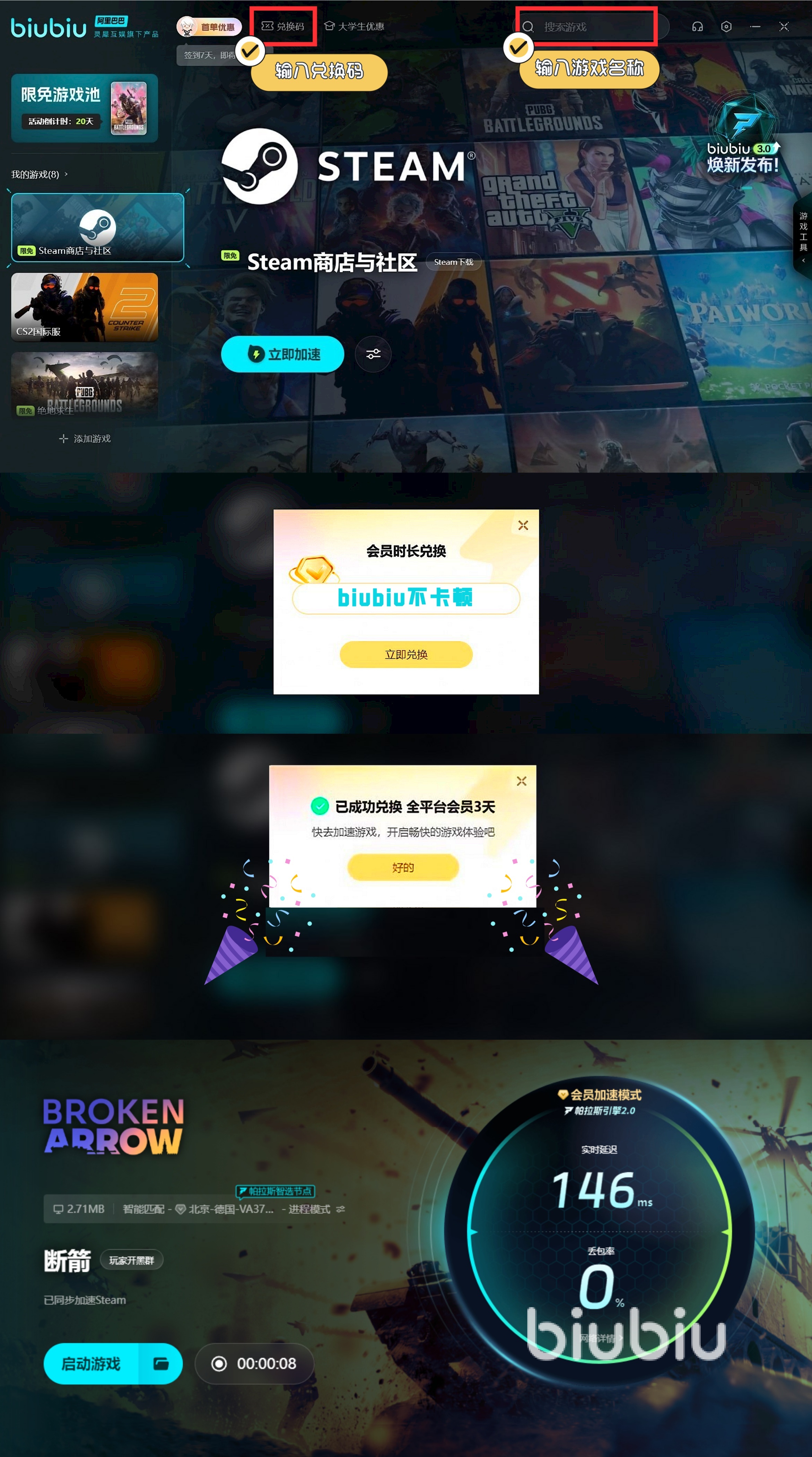 如果玩家到時希望能得到更多加速機會,那么點擊界面內(nèi)兌換,然后借助【biubiu不卡頓】,這樣平臺小伙伴均可順利拿到72H的加速,不用在擔心遇到掉幀等方面的影響了。
