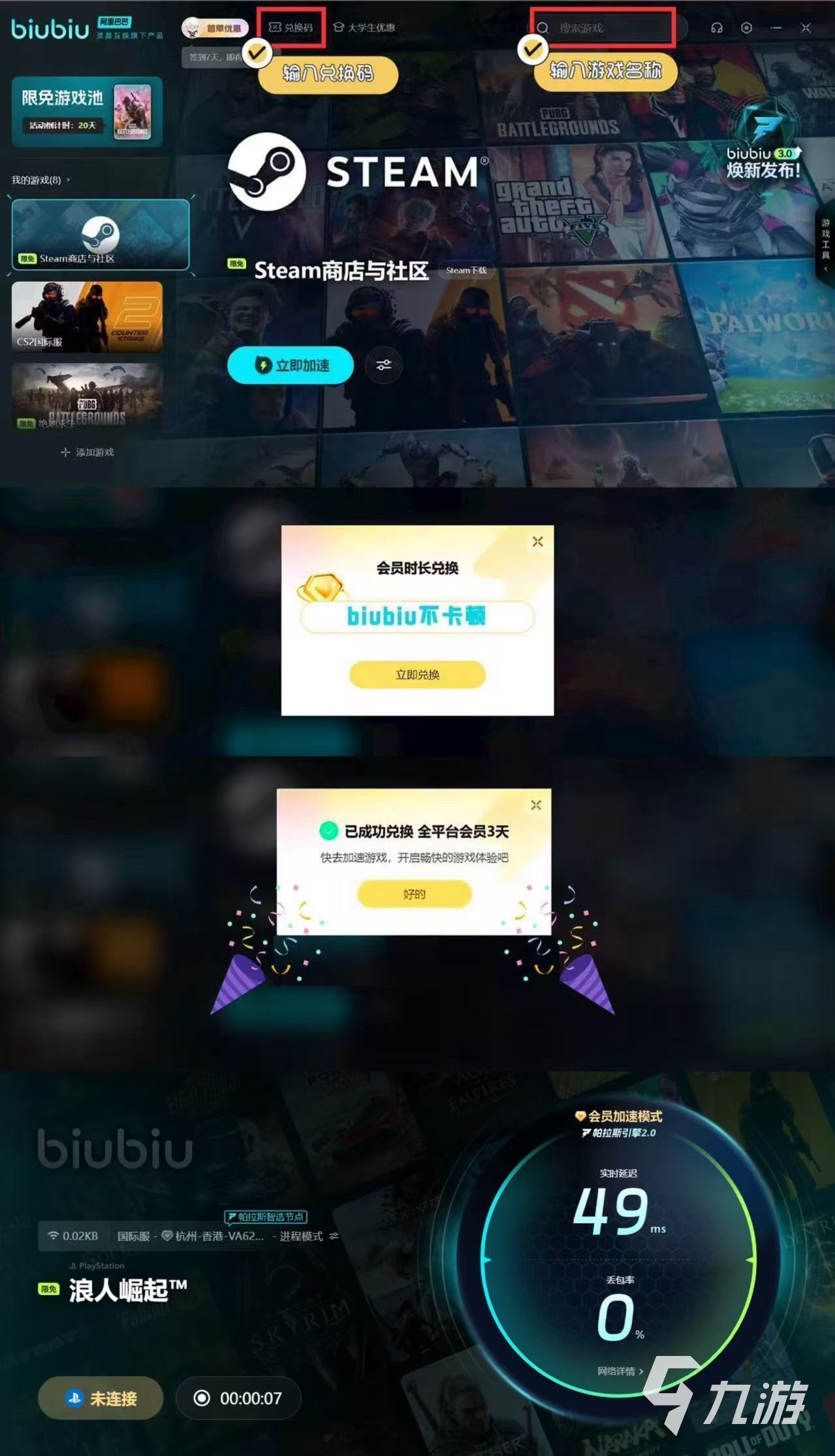 雖然說游戲是單機版的游戲,不需要聯(lián)網(wǎng)就能體驗,不過游戲只能通過ps來登陸,在連接上難免會有不穩(wěn)定的情況。想要加快游戲通關(guān)速度,可以試下biubiu這款加速器,更何況在加速器上能通過口令“biubiu不卡頓”能領(lǐng)取到3天的加速時間,新用戶注冊并登陸的話能直接獲得3h的加速。如果說玩家對于游戲玩法足夠熟練的話,基本上能覆蓋整個流暢,甚至是來一次二周目。