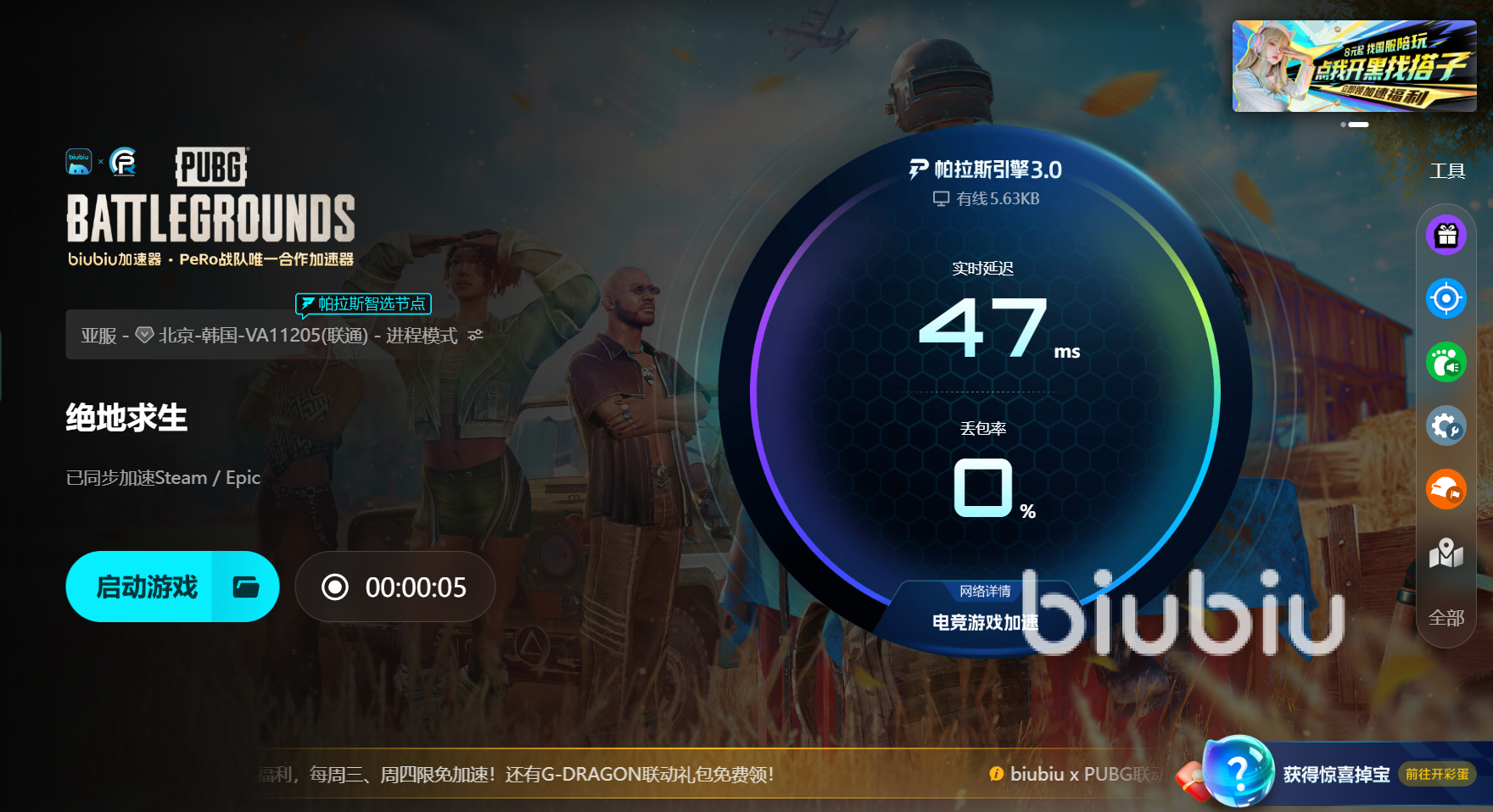 操作過程并不復雜。打開biubiu客戶端后,只需找到pubg并開啟加速,系統(tǒng)就會開始自動檢測網(wǎng)絡狀況并匹配最合適的節(jié)點,全程無需調(diào)整任何參數(shù)。加速在后臺靜默運行,不占用系統(tǒng)資源,也不會影響畫面表現(xiàn)。幾秒鐘后網(wǎng)絡路徑被重新打通,再次進入游戲時加載畫面順暢推進,不再長時間停滯在黑屏界面,進入大廳的過程一氣呵成,就像有人提前為連接鋪好了一條直線通道。