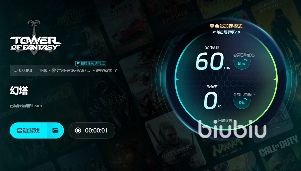 所有的玩家還可以借助【biubiu不卡頓】這一兌換口令再額外領(lǐng)取72小時(shí)的免費(fèi)體驗(yàn)時(shí)長(zhǎng),加在一起使用的話,讓玩家們最多可以擁有75小時(shí)的免費(fèi)體驗(yàn)機(jī)會(huì),讓大家都能夠充分的了解平臺(tái)的加速效果。如果覺得它的加速效果符合自己的使用需求,就可以充值體驗(yàn)了,新用戶也會(huì)擁有多種充值福利,折算下來一天只需要幾毛錢就可以輕松暢玩更多熱門游戲了,而且不同于其他平,操作步驟復(fù)雜難懂,biubiu的整體界面都是很簡(jiǎn)潔的,我們?cè)谙螺d完成之后,只需要首頁搜索幻塔即可快速完成加速處理。進(jìn)入詳情界面,大家還能實(shí)時(shí)掌握當(dāng)前的加速狀態(tài),能夠看到延遲以及丟包數(shù)據(jù),如果覺得網(wǎng)絡(luò)延遲過高,可以手動(dòng)切換節(jié)點(diǎn)。