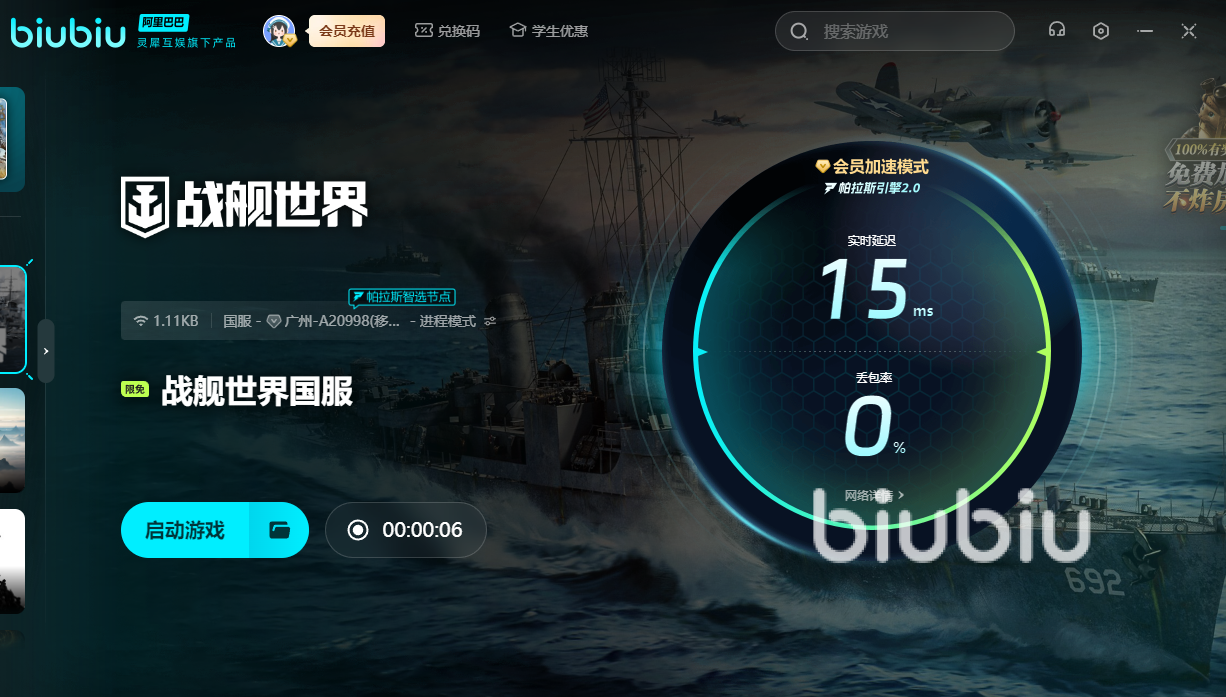 戰(zhàn)艦世界作為一種海戰(zhàn)大作,我們可以自由航行并攻擊對(duì)手,要是太卡的話就會(huì)淪為對(duì)方的靶子。所以我們可以用上biubiu,加速之后就能更好地操控手中的戰(zhàn)艦并擊敗對(duì)手。新用戶的話可領(lǐng)取3小時(shí)的免費(fèi)加速,另外新老用戶輸入【biubiu不卡頓】,就能額外獲得三天免費(fèi)加速。要是大家偶爾也想要跟海外的人切磋一下,就可體驗(yàn)一下國(guó)際服。用上加速器后,又能無(wú)視網(wǎng)絡(luò)限制,直接來(lái)到大洋彼岸,與人開(kāi)始對(duì)戰(zhàn)。