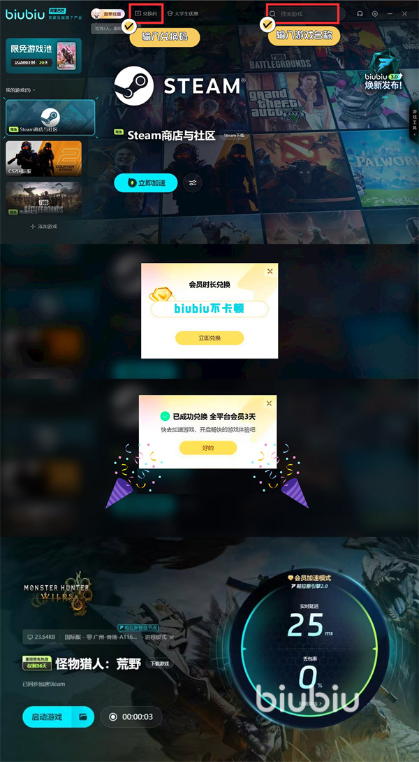 考慮到有些朋友希望能解鎖更多加速福利,因此平臺(tái)也是特地帶來(lái)了兌換碼福利,玩家現(xiàn)在可考慮去點(diǎn)擊兌換,然后借助【biubiu不卡頓】就能順利領(lǐng)取到72h的加速了哦。