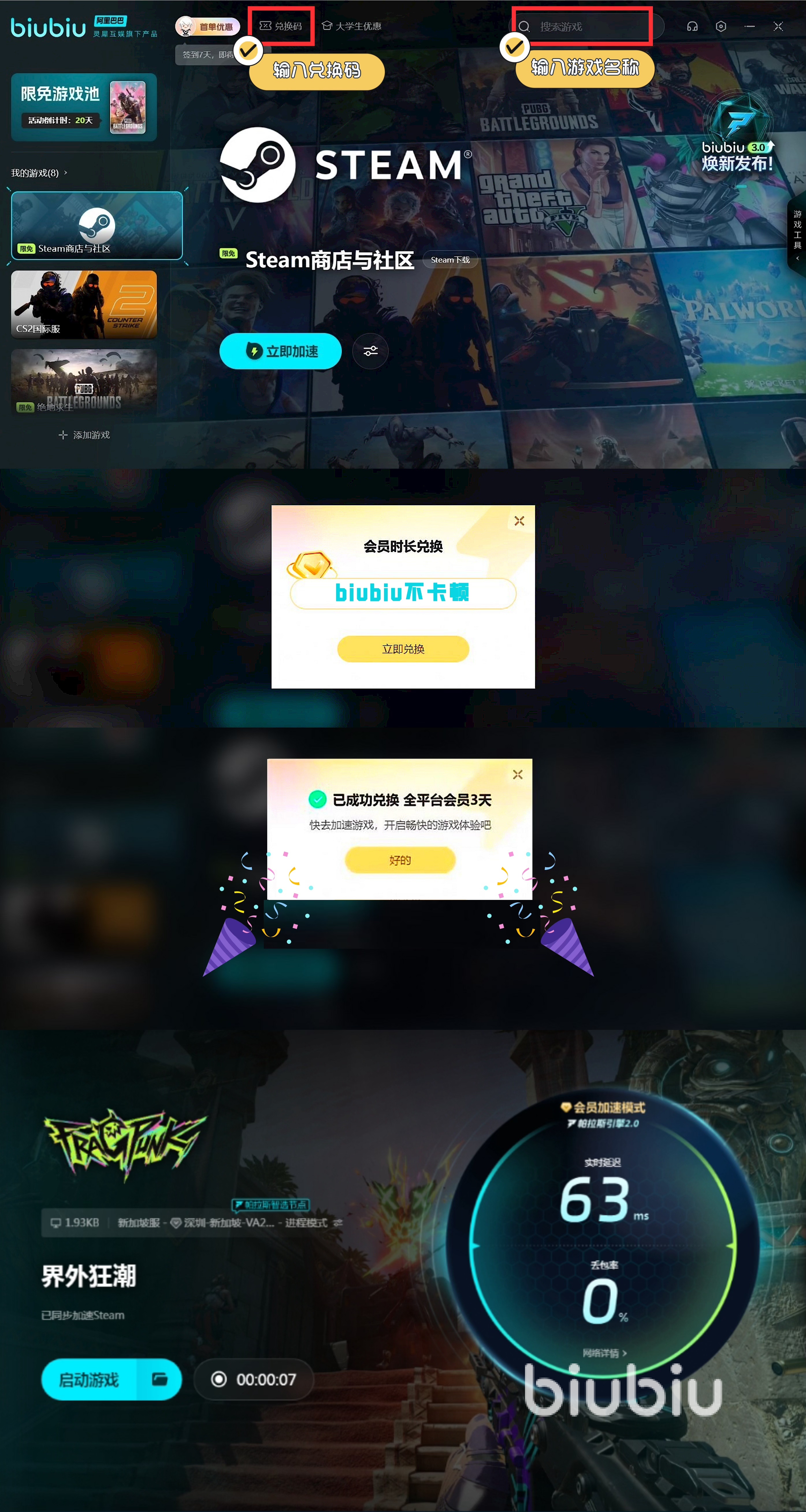 這個(gè)加速器除了可以幫助小伙伴們?nèi)ハ螺d游戲之外,還能帶來(lái)不錯(cuò)的加速效果,而且對(duì)新用戶(hù)有很多福利,比如新人在注冊(cè)的時(shí)候直接有3小時(shí)免費(fèi)加速時(shí)間,此外,大家還可以額外用biubiu不卡頓兌換到手3日的體驗(yàn)時(shí)間。