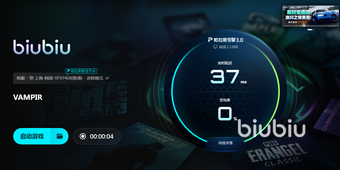 本質(zhì)上來說,以虛幻4為基礎(chǔ)的Vampir,在運(yùn)行過程中會產(chǎn)生大量的數(shù)據(jù)——幀、動作、技能數(shù)據(jù)。游戲卡頓,延遲都是因?yàn)檫@些數(shù)據(jù),因得不到足夠的網(wǎng)絡(luò)傳輸支持,發(fā)生數(shù)據(jù)丟包造成的,所以解決這個問題,只需要保持?jǐn)?shù)據(jù)及時、完整的傳輸即可。游戲加速器就是這個作用,這里推薦大家可以嘗試一下剛進(jìn)行功能革新升級的biubiu加速器。