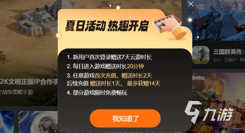 玩家只要點(diǎn)擊上方的鏈接入口,就可以利用九游的云游戲功能在線進(jìn)行游玩了,現(xiàn)在正好有多個(gè)福利活動(dòng),第一個(gè)是新用戶首次登錄贈(zèng)送7天的免費(fèi)云游時(shí)間,第二個(gè)是每天只要登錄游戲就獲贈(zèng)20分鐘免費(fèi)時(shí)長(zhǎng),第三個(gè)是當(dāng)玩家對(duì)任意一款游戲進(jìn)行首充的時(shí)候,獲贈(zèng)2天的免費(fèi)時(shí)長(zhǎng)。