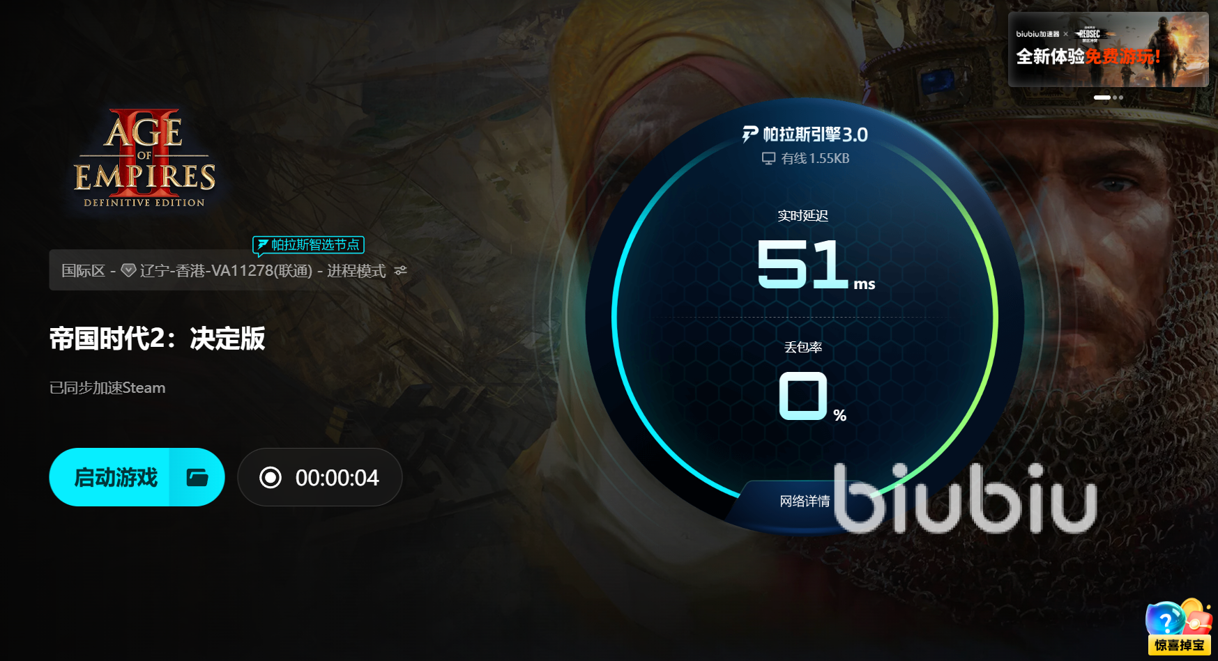 操作流程很直接打開biubiu搜索帝國(guó)時(shí)代2,選擇對(duì)應(yīng)游戲圖標(biāo),點(diǎn)擊加速,開啟后系統(tǒng)自動(dòng)體檢鏈路并匹配更穩(wěn)節(jié)點(diǎn),無(wú)需改端口與參數(shù),前臺(tái)返回游戲即可繼續(xù)讀條,后臺(tái)運(yùn)行輕量對(duì)幀率與CPU占用干擾可忽略。