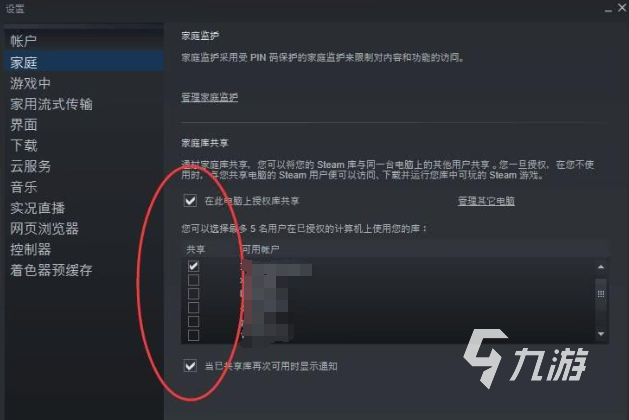 接著找到Steam左上角的按鈕,在賬戶選擇家庭,然后點擊下方的共享,可以看到能分享的賬戶名稱,想給誰就勾選前面方框就行了。不過用Steam體驗游戲有個缺點,該平臺有時會連接不穩(wěn)定,使用biubiu就可以解決這個問題。
