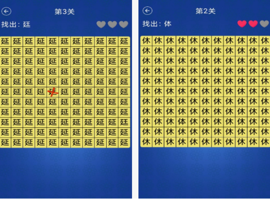 要有很好的演練,在每個關(guān)卡當中,通過仔細的觀察,每一行或者是每一列當中,顯示出的文字,找出里面與大部分文字不一樣的,就可以順利的完成關(guān)卡。每次都有三次機會,無論是筆畫不同或者是偏旁,可能會有一些差異,都會讓大家感受到我國文字所具備的獨特之處??瓷先ヒ粯拥奈淖?,不過卻因為一個筆畫之間的差異就是完全不一樣的。