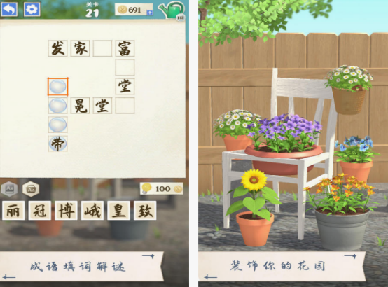 不僅與我國的成語文化有關(guān),也是與常見的接龍玩法保持一致的,你需要根據(jù)關(guān)卡的方塊布局,正確的在里面填入相應的文字以后,如果能在讀取的時候成為常見的四字成語,那么就可以進入下一個關(guān)卡當中進行其他的挑戰(zhàn)。還有豐富的故事劇情,你將進入一個非常美的花園里,通過完成任務獲得的獎勵,來滿足花朵所需要的水源,對花園進行裝飾。