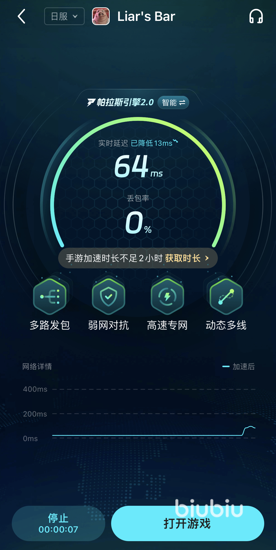 有一個biubiu軟件可以幫助大家優(yōu)化好網絡,主要把丟包率降低了,波動也穩(wěn)定好,那長時間接入客戶端都是順利的,在外面走動著玩就不容易掉線了。然后延遲也降低了不少,就算是在外面玩,受到的影響也很小的,卡頓是沒有了。