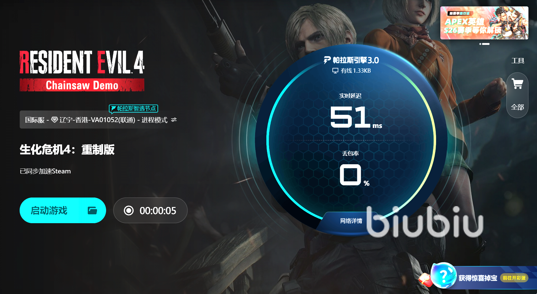 針對玩家的困擾,biubiu加速器準(zhǔn)備了福利。新用戶注冊即可免費領(lǐng)取24小時加速時長;所有玩家在客戶端首頁【兌換】處輸入口令【biubiu不卡頓】,還能額外獲得72小時加速體驗。這些福利不僅可以用于《生化危機(jī)4:重制版》,也能應(yīng)用在其他主流聯(lián)機(jī)游戲,讓玩家快速感受到優(yōu)化后的順暢效果。