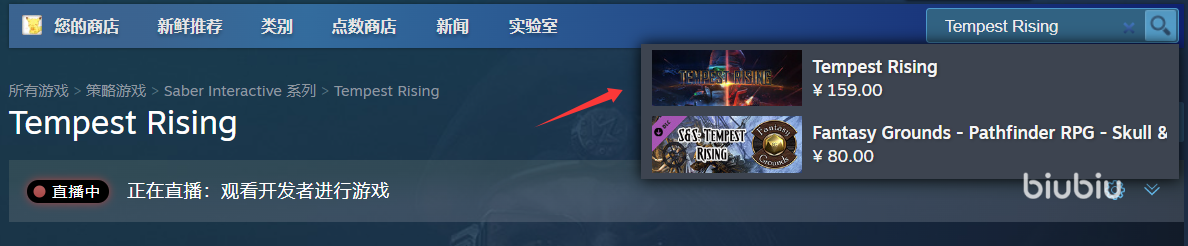 《風(fēng)暴崛起》在steam上叫做《Tempest Rising》,想要找到這款游戲,記得一定要復(fù)制這個英文名,然后粘貼在steam頁面右上角搜索欄中,等上一兩秒就會顯示這款游戲的預(yù)覽了。