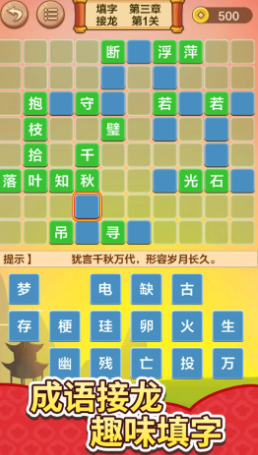 這一款游戲把傳統(tǒng)的文化玩出了新花樣,在這里,游戲分不同等級關(guān)卡,剛開始的時候是常見成語,后面慢慢的變成了冷門的典故,難度是一點一點往上加的,每一關(guān)的接龍成語都是隨機(jī)出現(xiàn)的,大家需要在規(guī)定的時間里想出尾字相同或者是讀音相近的成語接上,特別考驗反應(yīng)速度和成語積累量,游戲里還有提示的功能??梢酝ㄟ^猜字解釋幫大家找到答案,邊玩邊學(xué),還有計時賽和連擊獎勵,讓大家越玩越上癮。