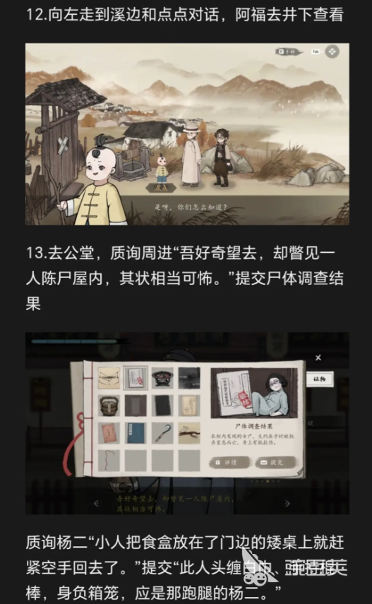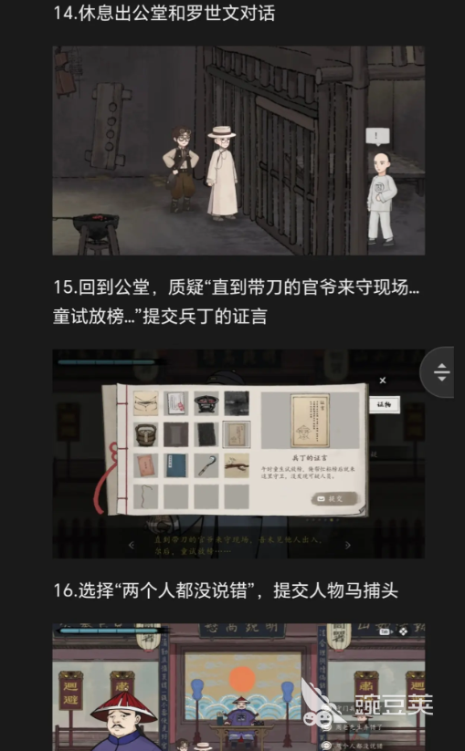 接著往左邊走,能看到高點(diǎn)跟他聊兩句,他會提醒“水井那邊好像有東西”,這時候趕緊去水井旁邊仔細(xì)看,蹲下來扒拉扒拉能找到個挺關(guān)鍵的證物,拿到手就知道這東西能跟周老先生的話對上,左邊逛完就得回去找老童生了,庭審休息那段時間千萬別閑著,正好補(bǔ)線索,到跟周老先生對質(zhì),之前收集的所有線索都得調(diào)動起來,跟周老先生聊完,他會把知道的事都告訴,還會給一個新的線索,這個線索能幫玩家在后面反駁馬捕頭。